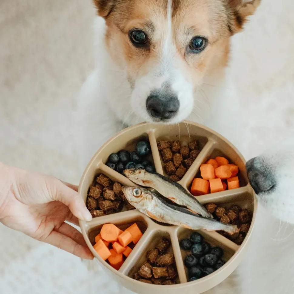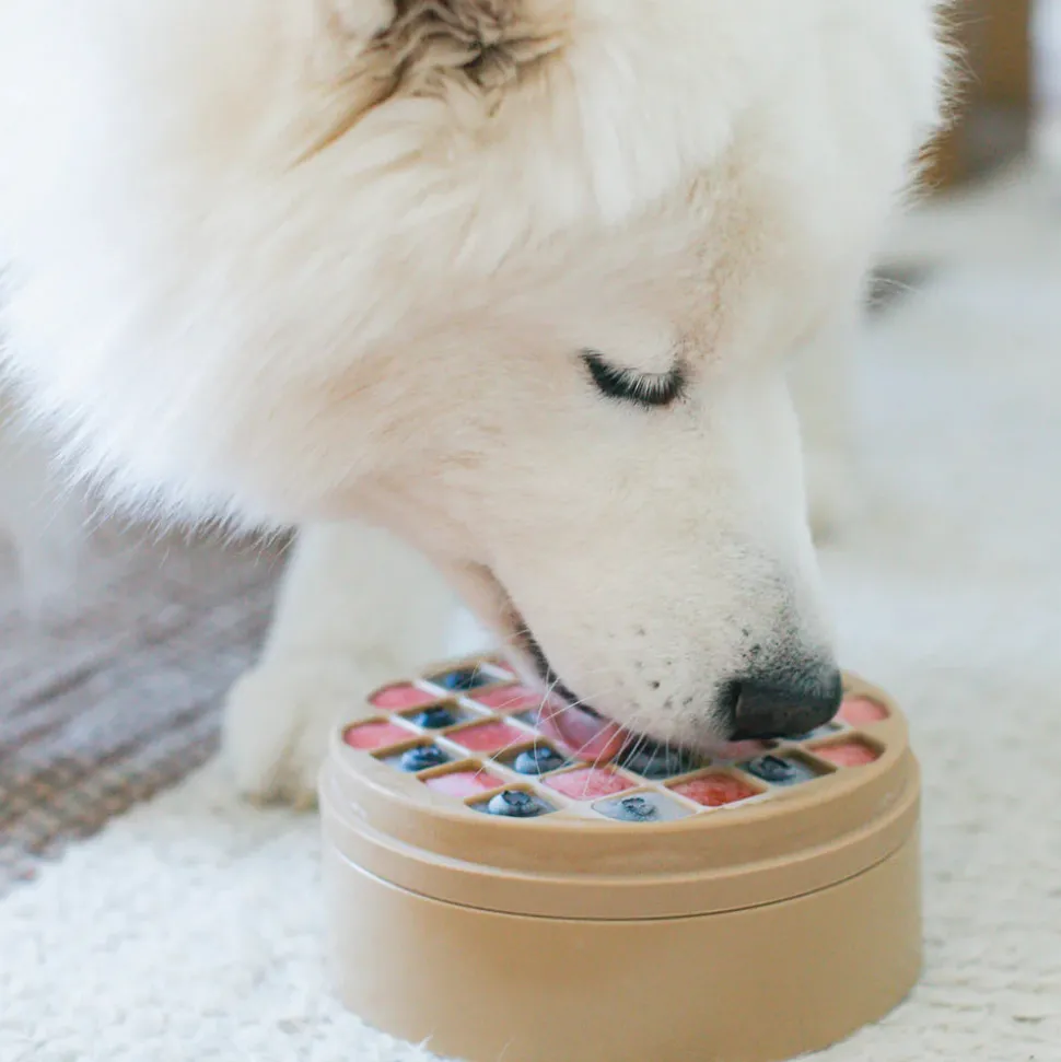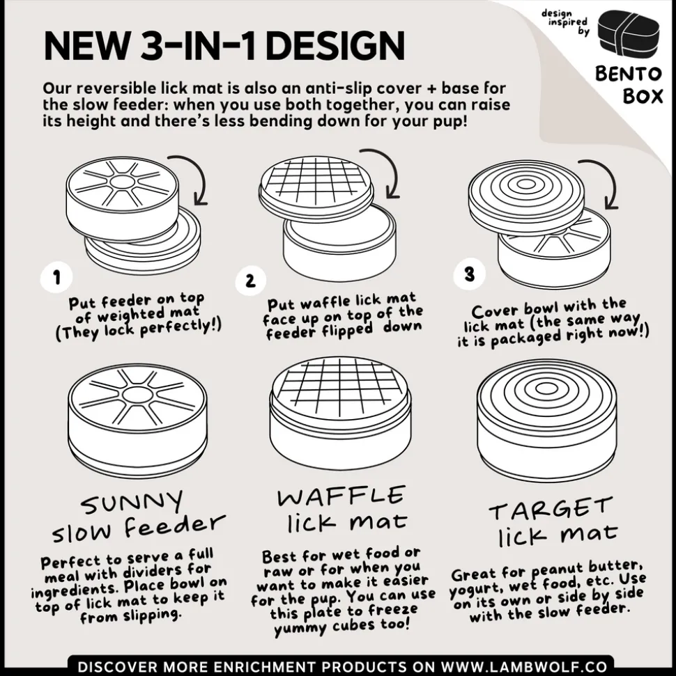Meet the brand new lick mat + slow feeder enrichment bowl, the 3-in-1 BENTO! Combining the classic patterns of lick mats in two difficulties on top of a slow feeder bowl with divided compartments, the two items can be used in 3 different ways (see instruction image).