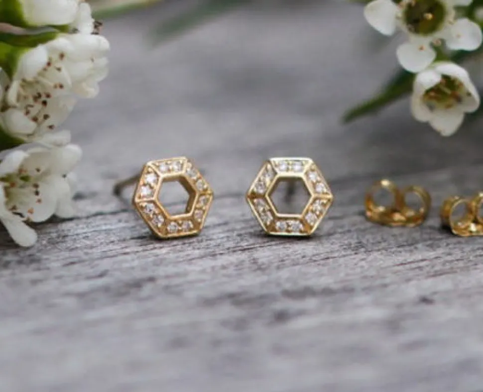 These earrings are part of the Beekeeper Collection, inspired by the vital pollinator and the sacred geometry of their hives. Bees are vital to the food supply yet their populations are in decline and endangered. Arte Vitta donates a portion of sales from this collection to The Bee Conservancy, which works to protect bee species and safeguard their environment.