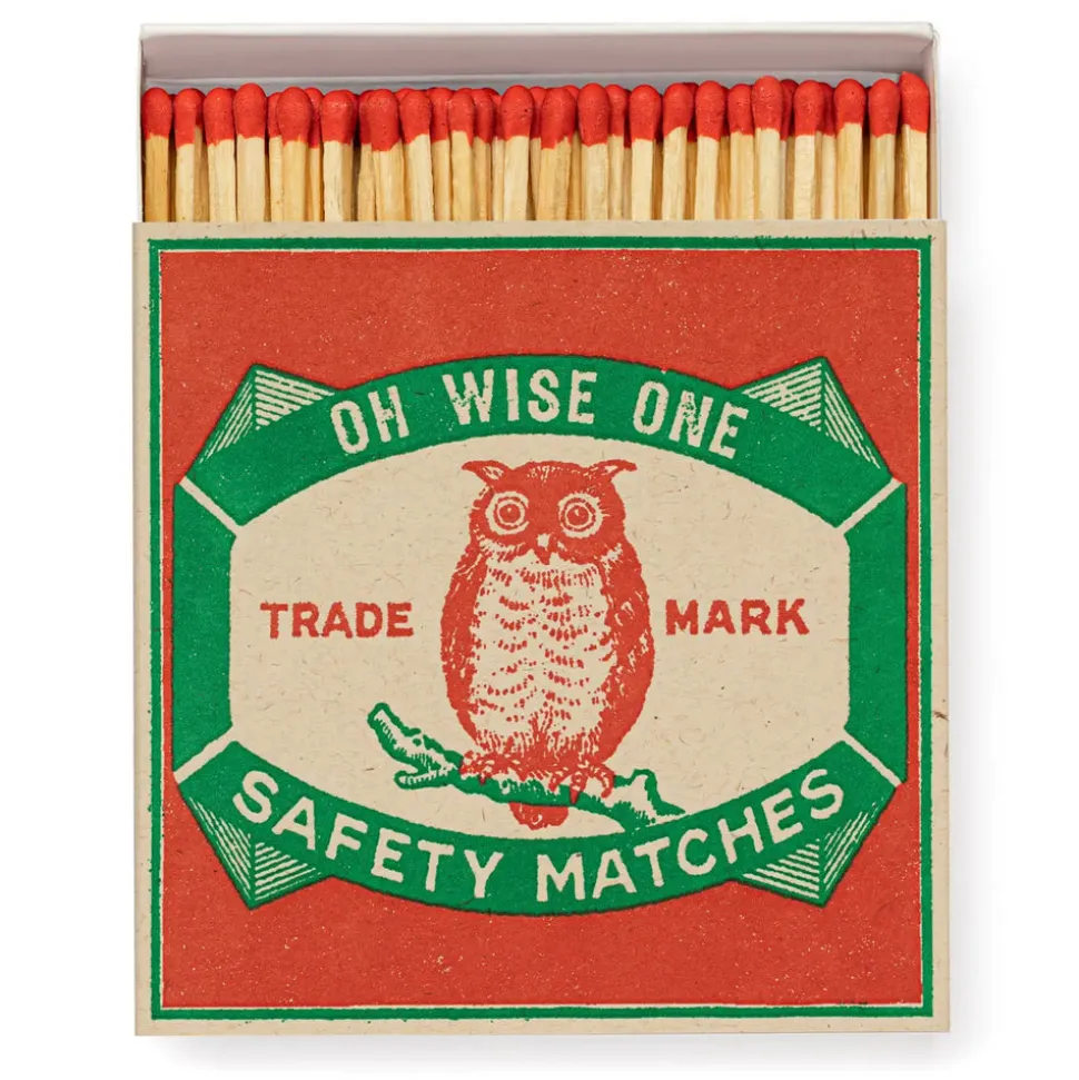 This matchbox features a vintage design discovered by Archivist Gallery, featuring an all-seeing and all-knowing owl — look at those eyes!
