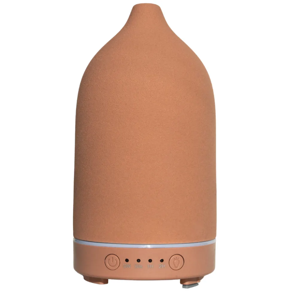 The Ceramic Essential Oil Diffuser fills your space with the soothing natural scent of essential oils. This electric plug-in diffuser uses ultrasonic vibrations to atomize water and essential oils into a fine mist, an alternative to traditional oil burners that use heat. Featuring a softly textured matte-finish ceramic cover in a warm adobe brick color and a non-reactive, BPA-free plastic water reservoir, this electric diffuser is a subtle presence in your space.