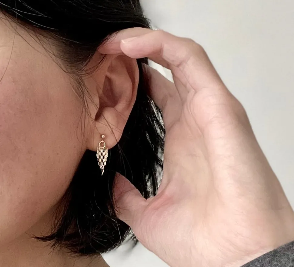 These lovely earrings evoke an angel’s wings. The delicate chain-links fluidly sway to catch the light. Lightweight and comfortable to wear.