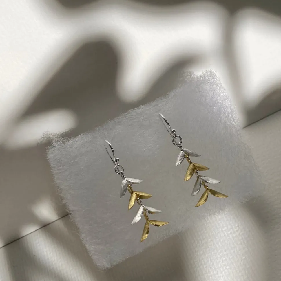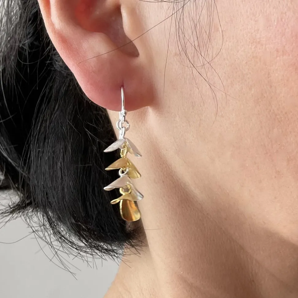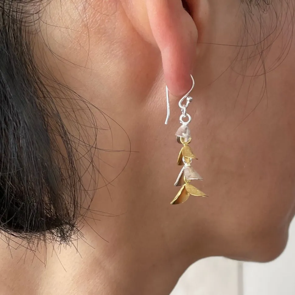 Inspired by the fluid movements of sea creatures, the Cinq Workshop Caudal Earrings feature fins that sway independently of one another. Alternating between matte sterling silver and gold vermeil, these earrings subtly reflects light as they move.