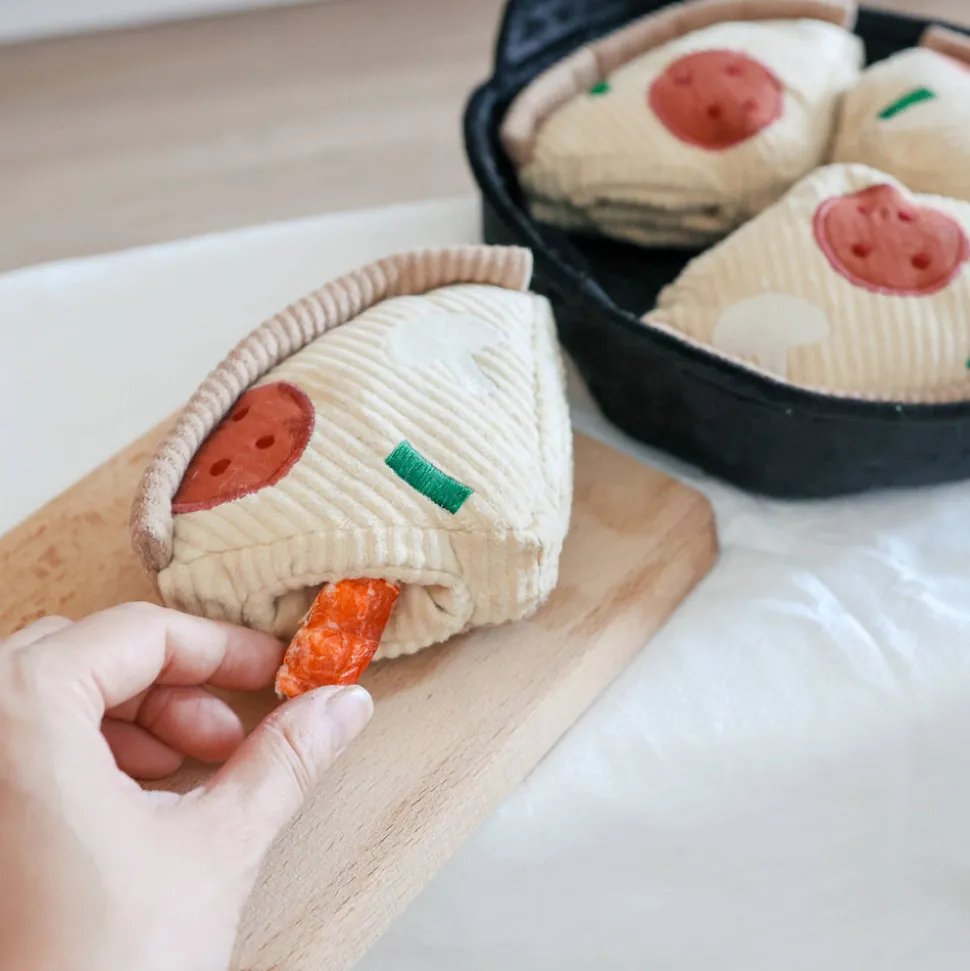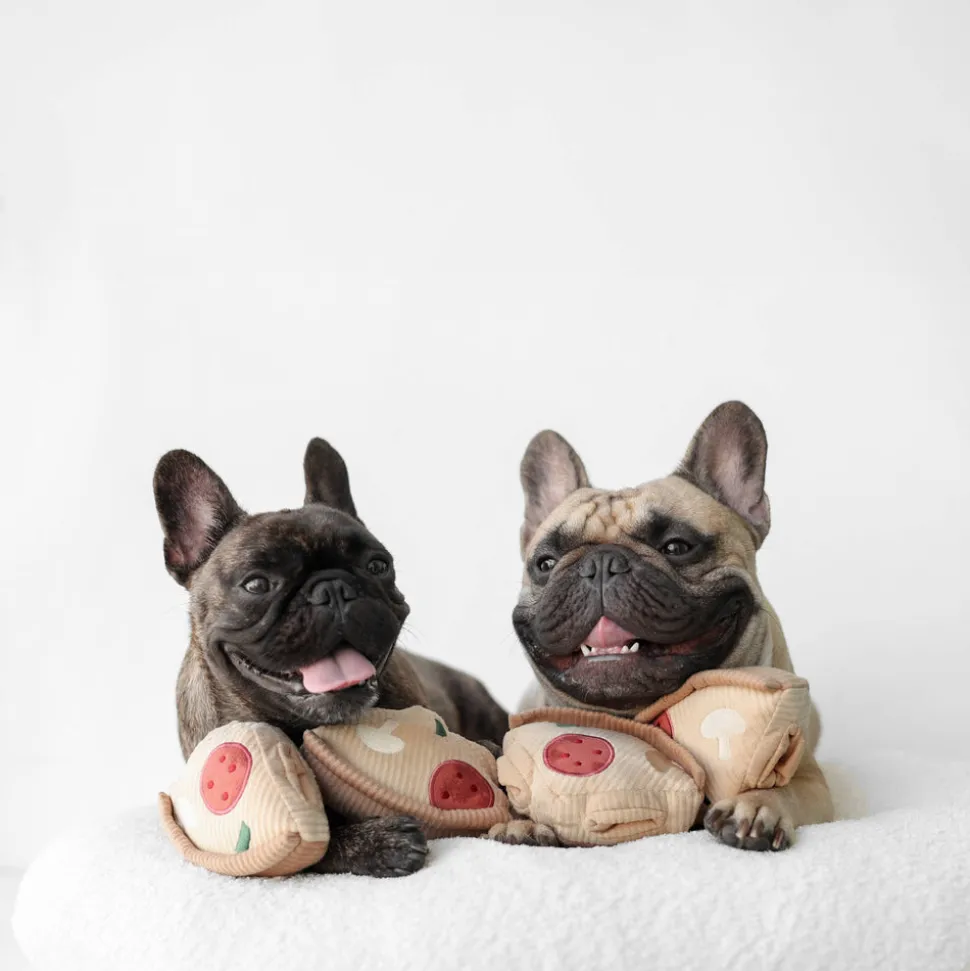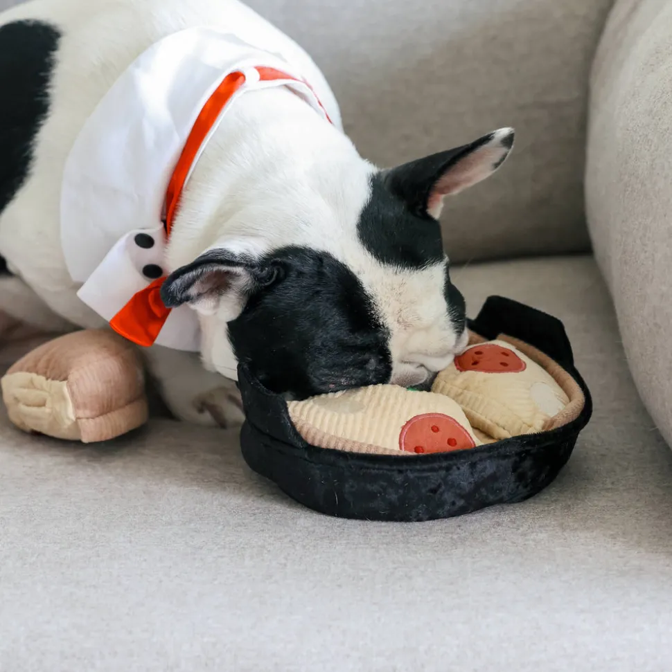 The DEEP DISH PIZZA dog toy from Lambwolf Collective is a life-size snuffle and burrowing toy in one. Each pizza slice squeaks and has two pockets in them (a total of 8 snuffle pockets in the whole pizza), and can be used as a snuffle mat when assembled together. The pizza dish is crinkly and makes for a perfect burrow toy as well! Also excellent for sharing as well 😉