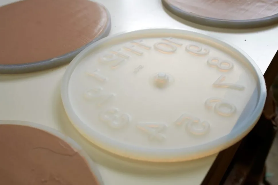 A tactile time piece, the Earth Clock has a smooth, matte surface and rounded edges. Cast from silicon dioxide (SiO2), also known as diatomaceous earth, this unusual wall clock brings a softness and sense of calm.
