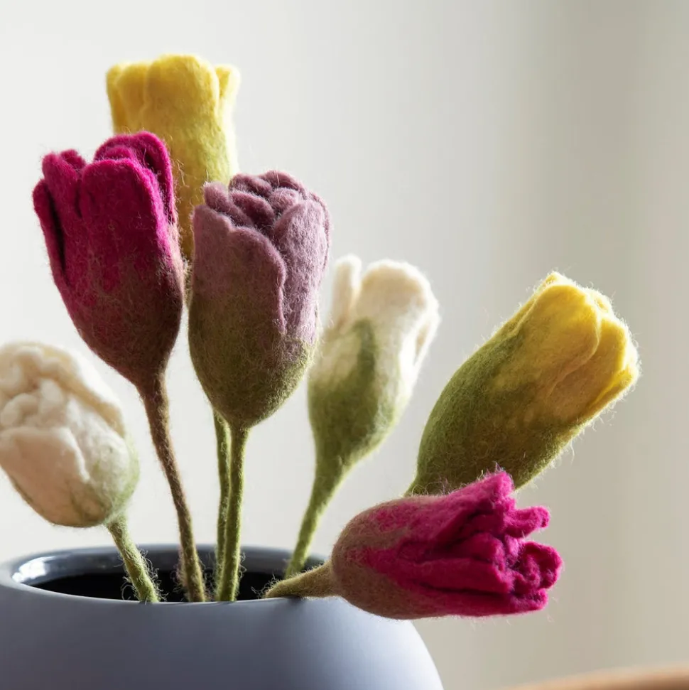 These lovely felt tulips are a great way to add some cozy, sustainable decor to your home. Gry & Sif felt “flowers” are designed in Denmark and handmade by skilled women in Nepal from 100% New Zealand wool. Their felt greenery is a great addition or alternative to dried flower arrangements.