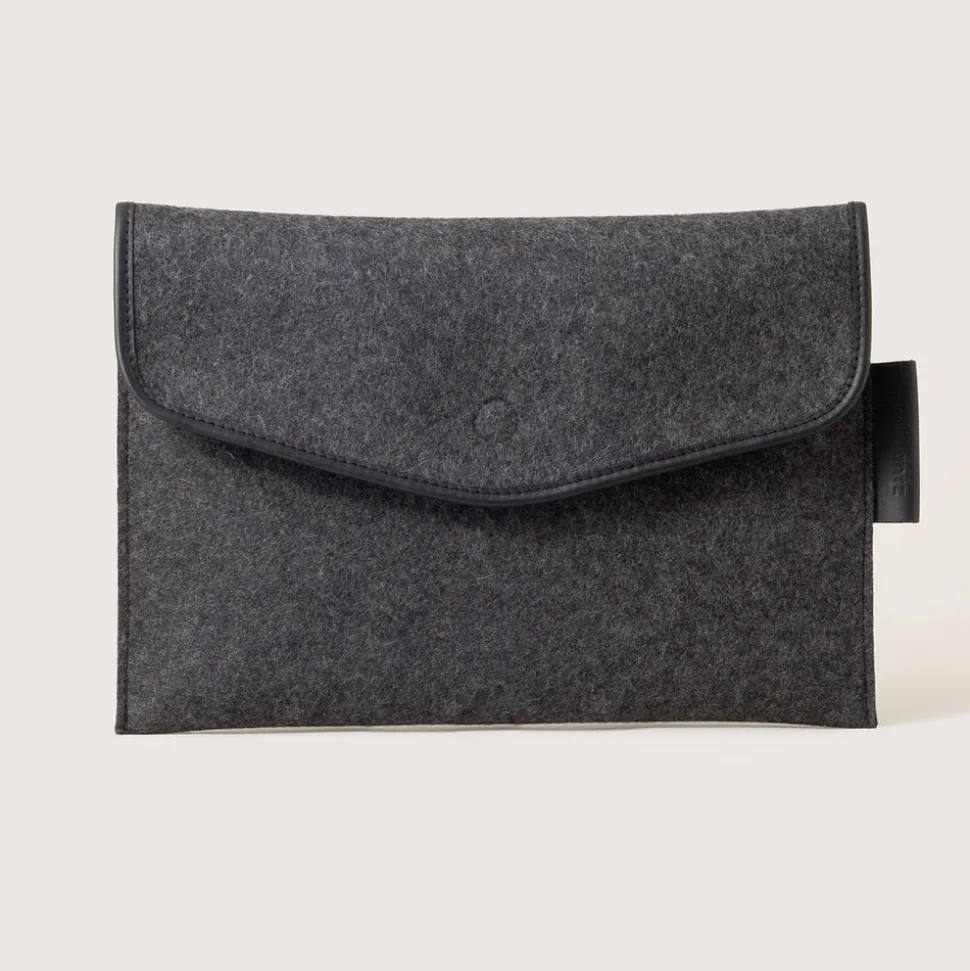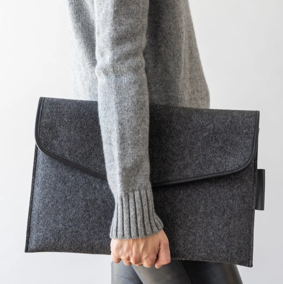 Hearkening to the elegant folios of the past, the large envelope clutch has been reimagined as a stylish laptop sleeve. The plush and vibrant merino wool protects your tech and accessories from damage and scratches, while the vintage-inspired leather edge binding gives structure and elegance.