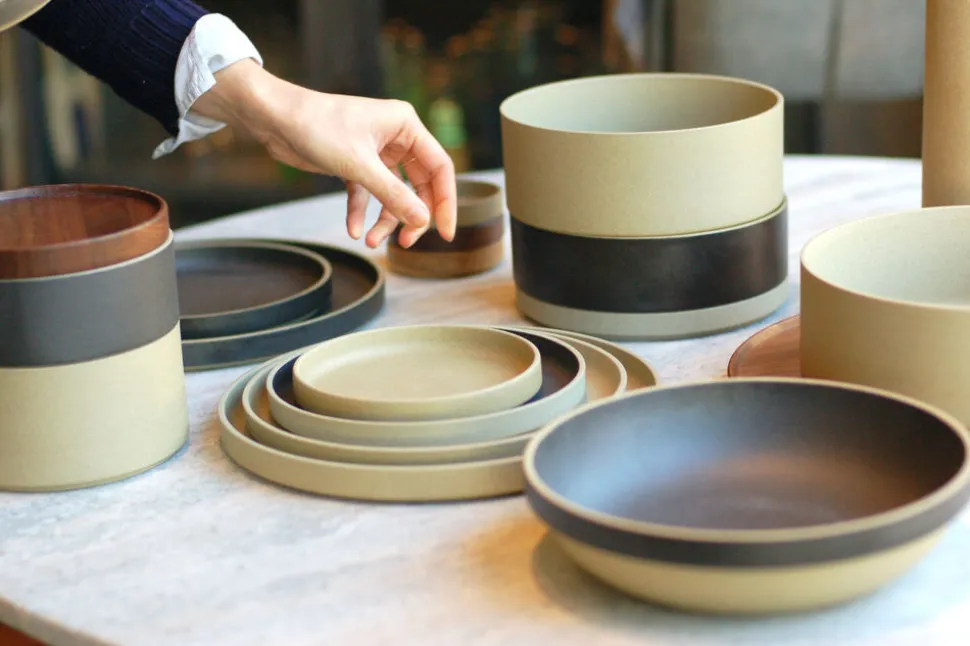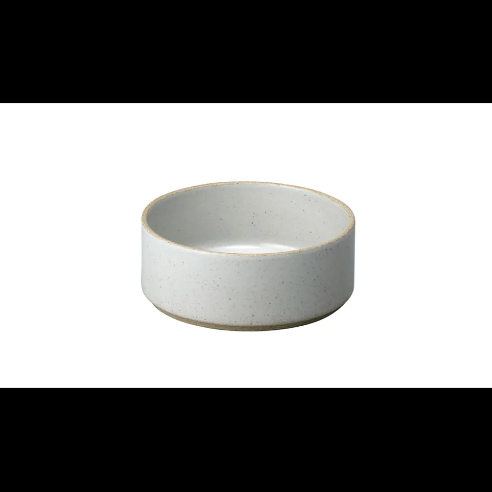 Made from a mixture of porcelain and clay, Hasami Porcelain has a tactile feel, modern form, and roots in Japan’s pottery tradition. The “gloss grey” is a glossy light grey glaze with faint, dark gray specks and a contrast rim.