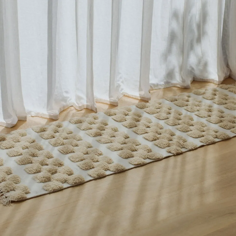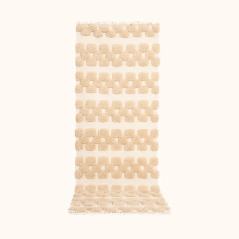 The Isabela Rug is a hand knotted runner in shades of light, warm beige with a geometric stripe pattern created by contrasting textures and heights. This neutral runner is perfect for hallways, kitchens, or bathrooms, or as a cozy place for your feet to land when you wake up in the morning.