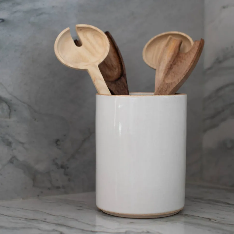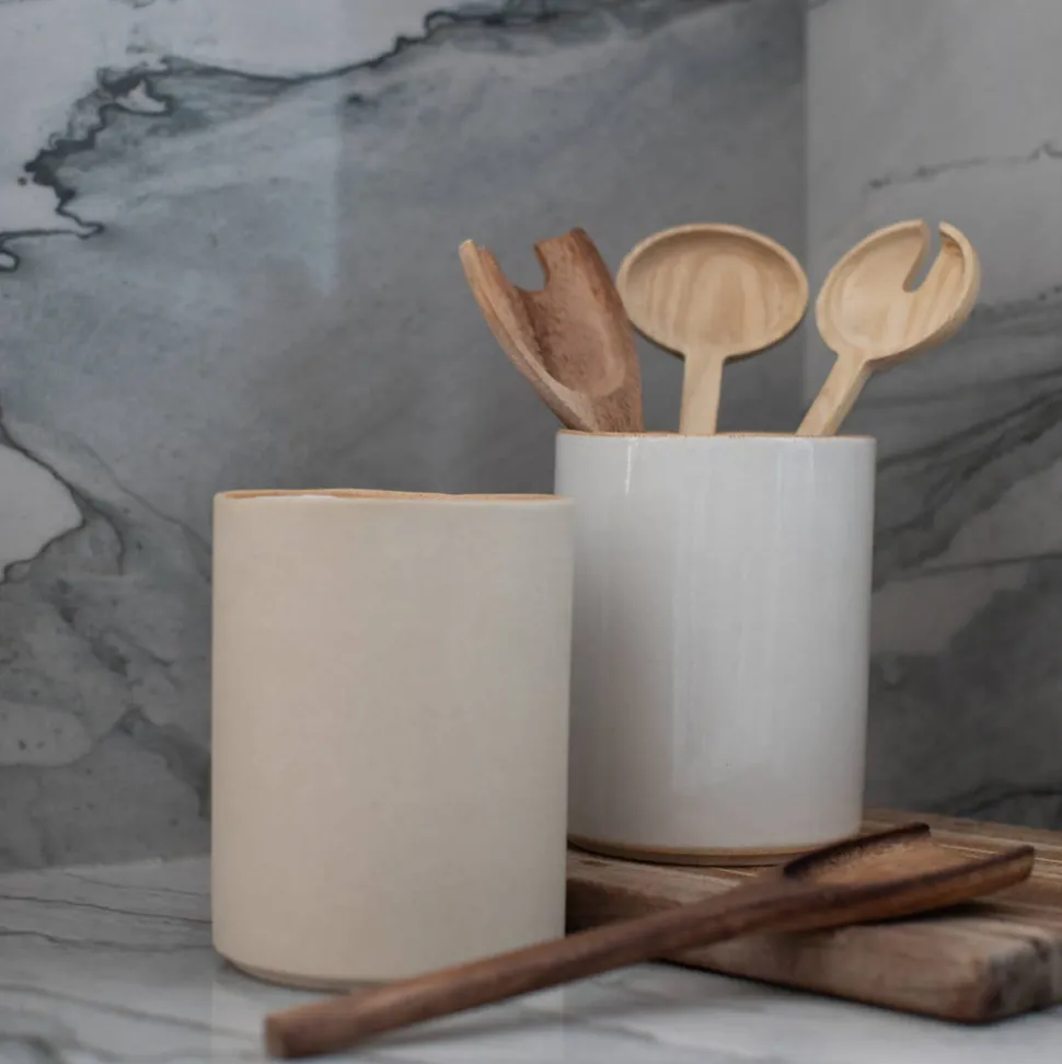 This minimal stoneware utensil crock is the ideal size for holding all your kitchen tools from spatulas to ladles to wooden spoons. Each piece is handmade using proprietary sand stoneware and finished in their signature ivory glaze. The glaze on the rim of each piece has been removed to allow the warmth of the sand clay to be highlighted.