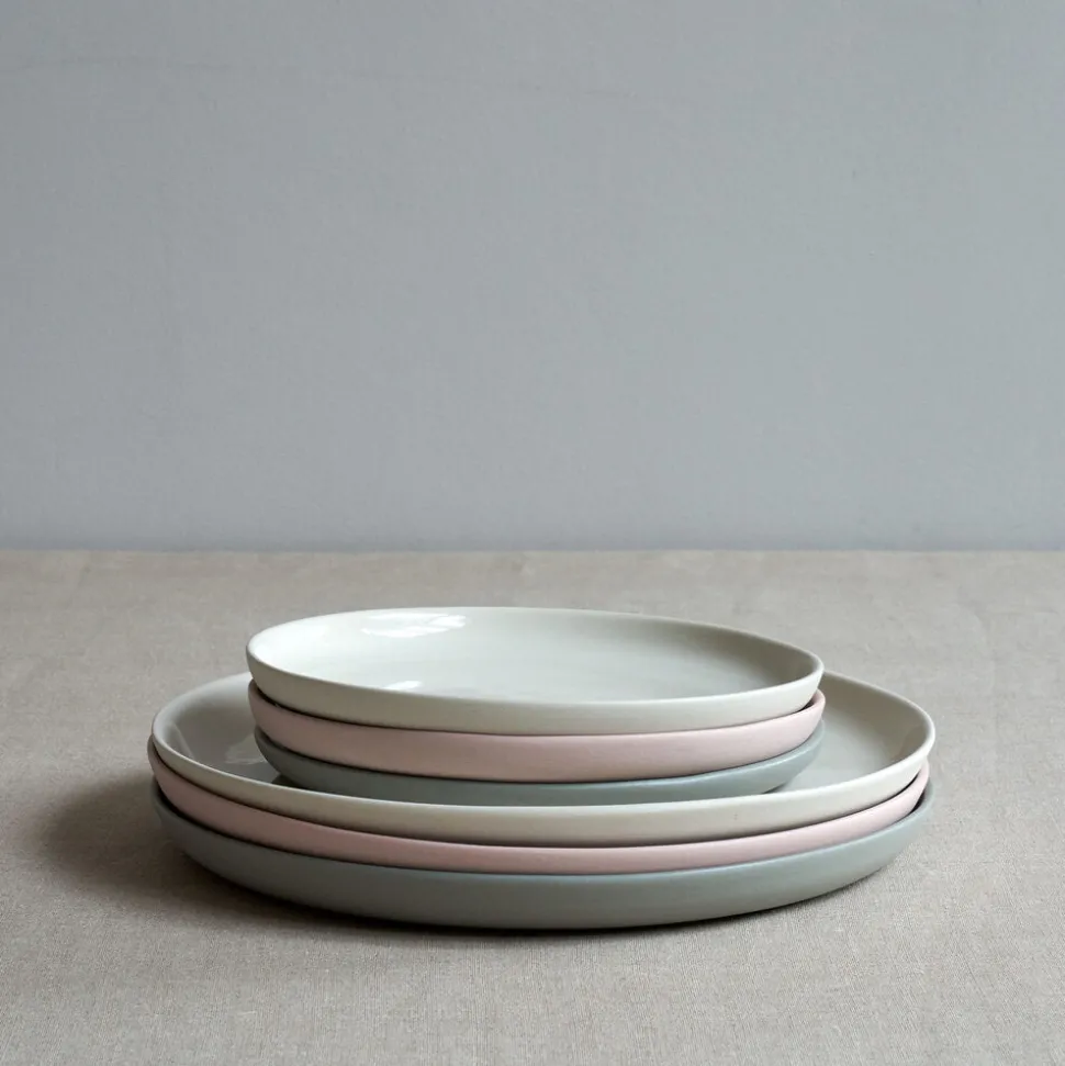 Handmade porcelain dishes with a smooth pebble-like finish. With a matte unglazed exterior and clear glazed interior, these plates will complete any dinner party. The porcelain is high quality and fired at extremely high temperatures, making it the strongest and most durable material for dishes.