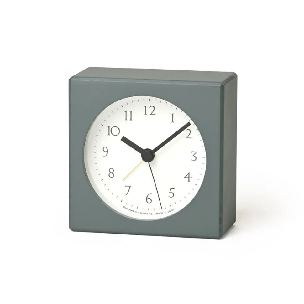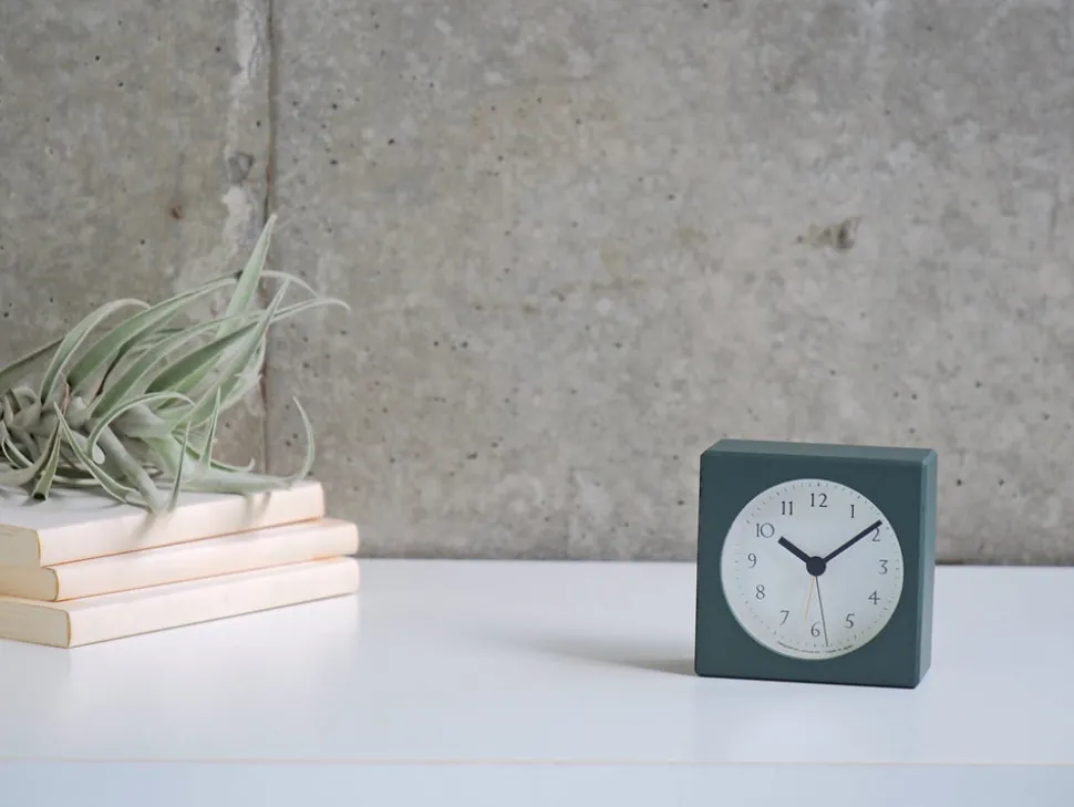 An alarm clock in a muted green, for a restful environment. Has a clean, easy-to-read clock face, in a solid beech wood square body that is beveled for a comfortable finish when held in the hand.