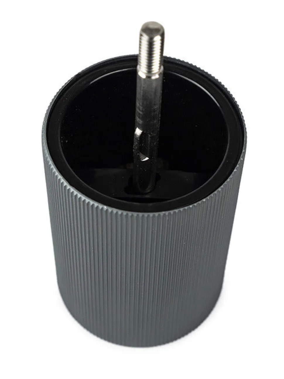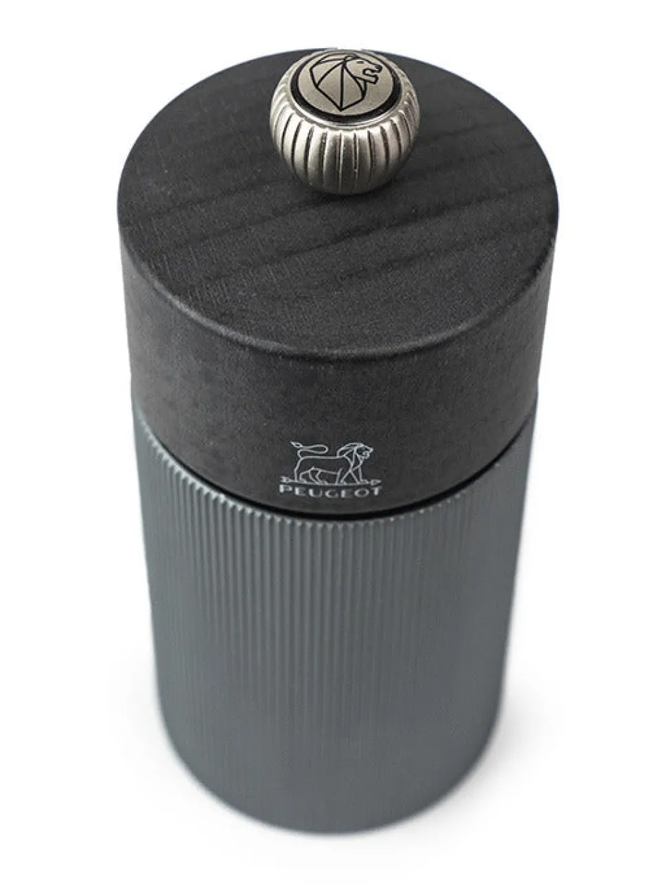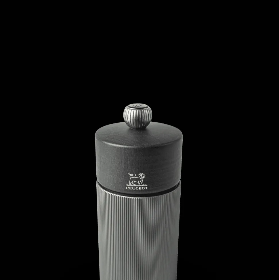 This pepper mill is thoroughly contemporary in look, with elegant striations that subtly reflect light and contrasts with the wood top. Perfectly sized for use at the table and pairs beautifully with the Aluminum Line salt mill.