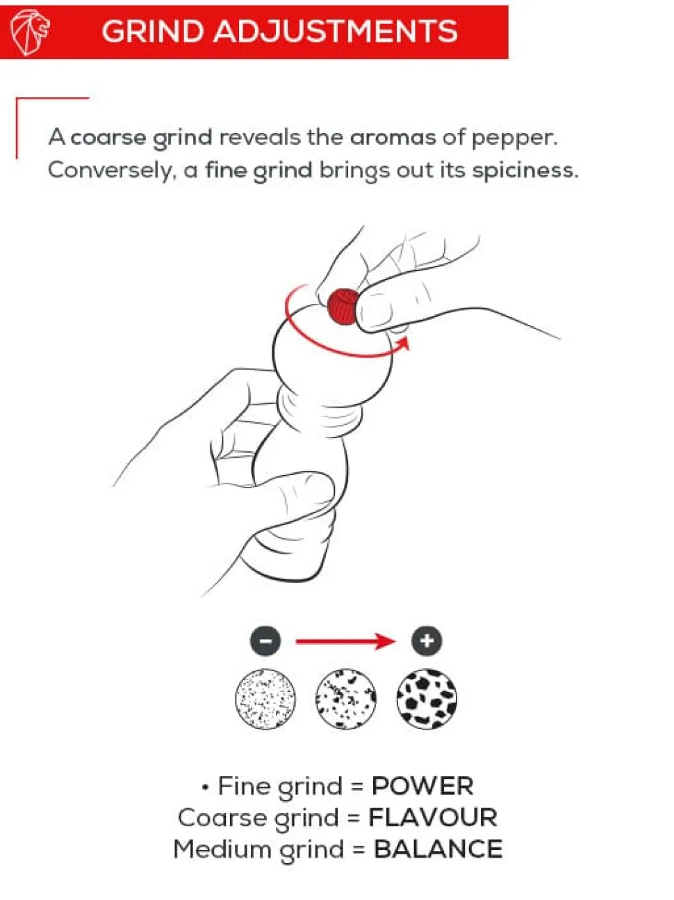 For grinding black, white, green, and red pepper, pink peppercorns (no more than 15% in a pepper blend) and coriander seeds. The grind may be adjusted by turning the button on top.