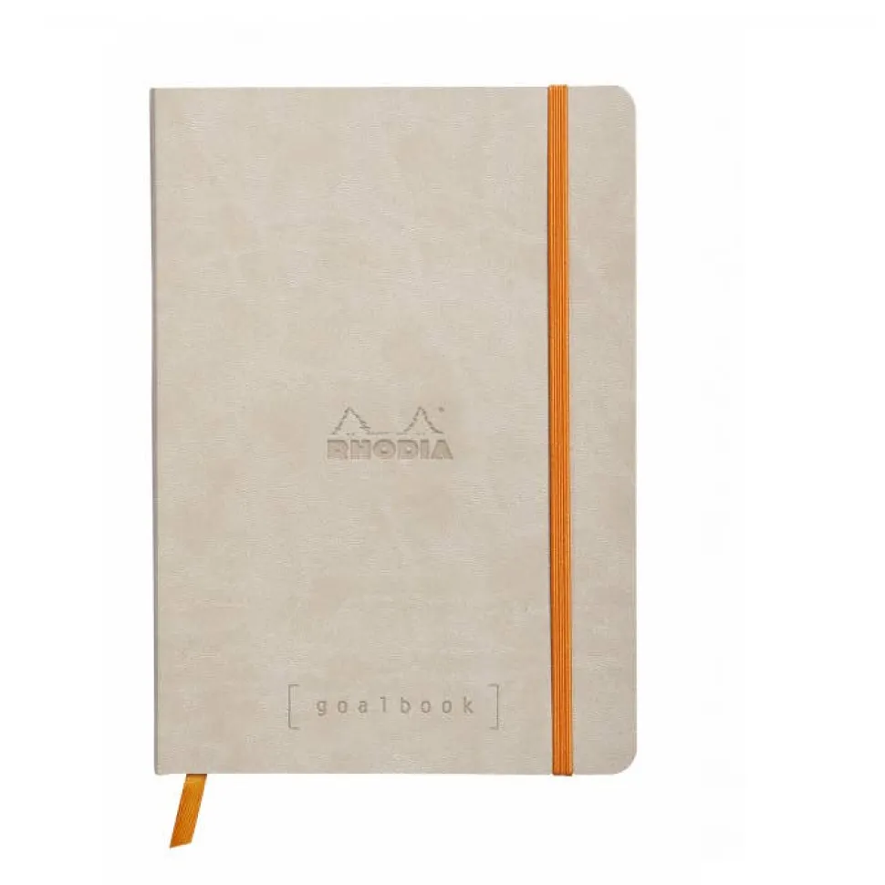 The Goalbook has 224 numbered dot grid pages, a 6-page table of contents, an undated annual calendar, and an undated monthly calendar. Also features two ribbon bookmarks, an expanding back pocket, and an elastic closure and pen loop, all encased in a soft, supple cover with an embossed Rhodia logo.