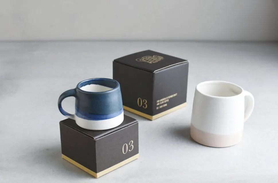 Two layers of translucent glaze on porcelain give each mug a unique character. Thrown on a potter’s wheel.