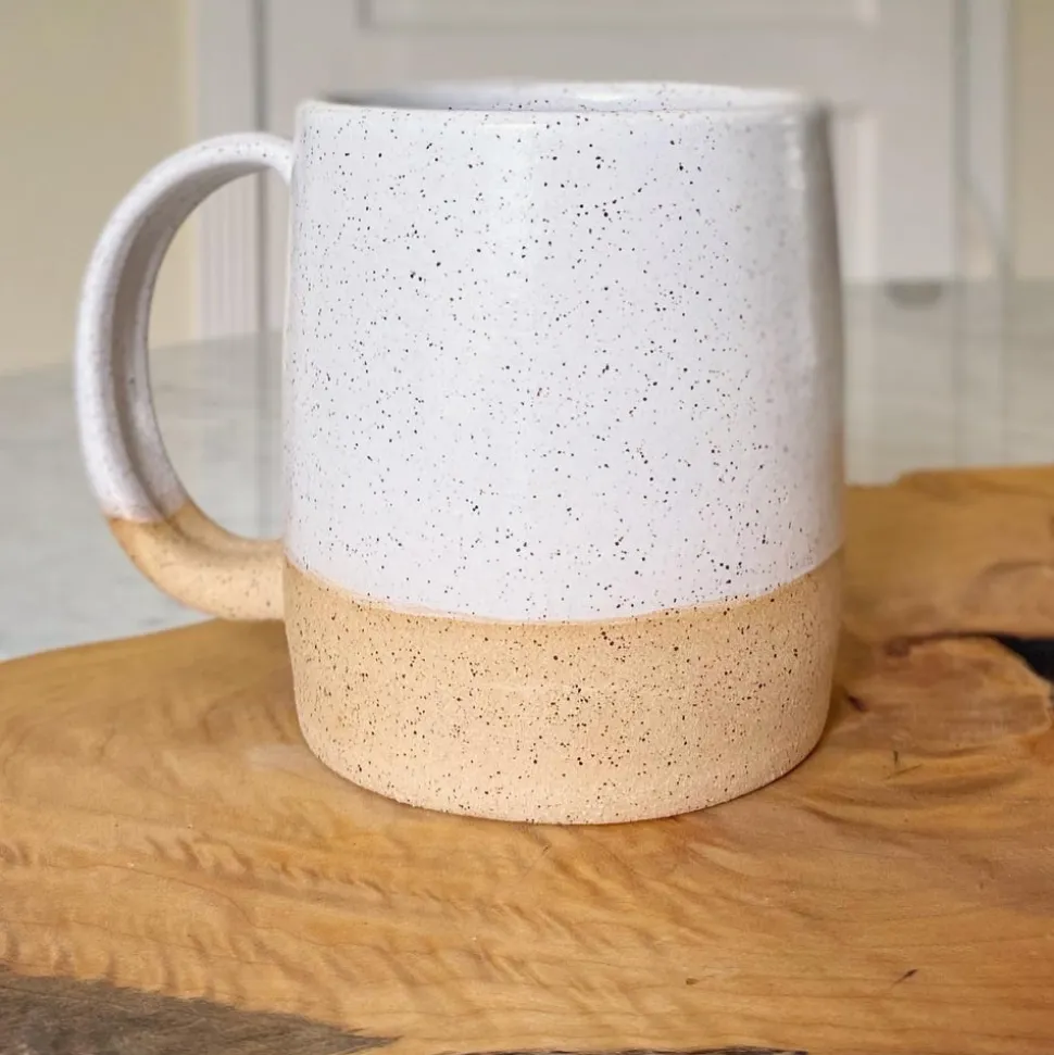 Unglazed clay banded with a matte-finish glaze provides a pleasing study in contrasts of texture and color. These sturdy mugs are both contemporary and rustic, the perfect size to wrap your hands around for a cozy cup of tea or hot chocolate on a crisp morning. Thrown on a wheel by Vermont-based potter Natania Hume, each individual mug has its own character and will have subtle variations in form, color and size, reflecting the handmade nature of the line.