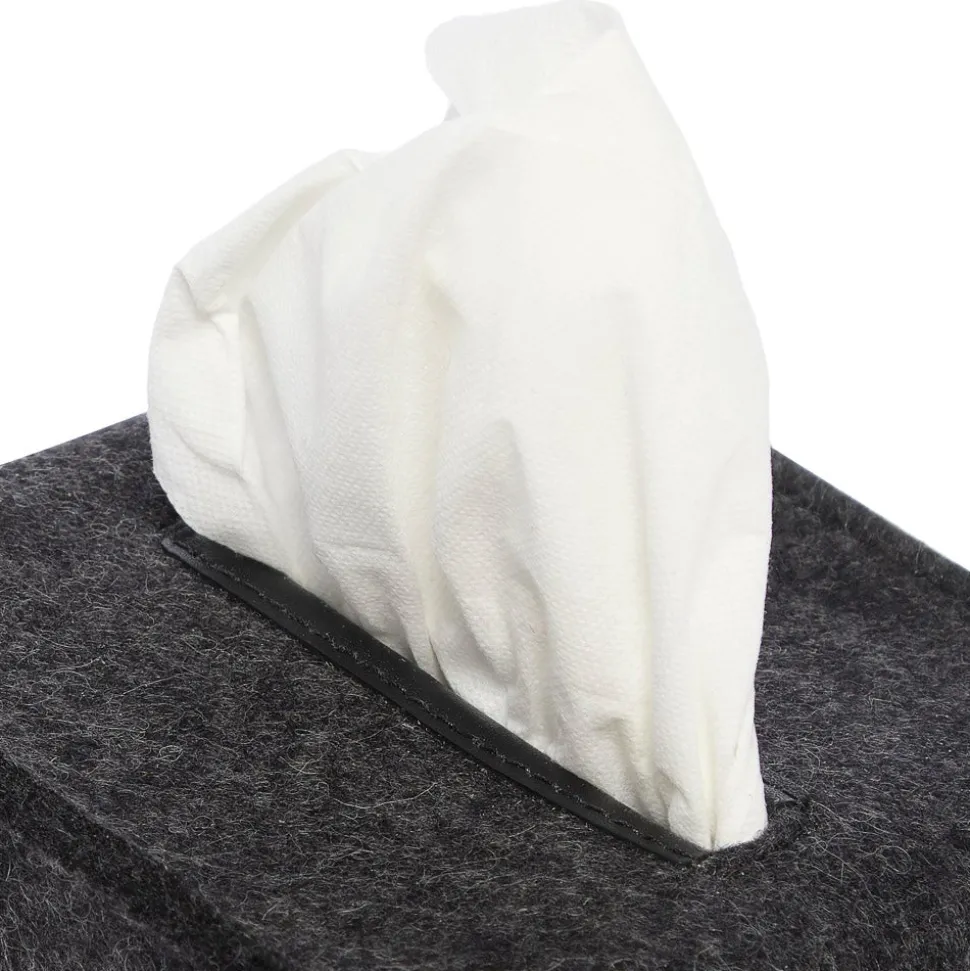 A stylish tissue box cover for the stylish home. Cover up branded tissue boxes with a simple and minimal felt sleeve for that last finishing touch in your home. Leather trimmed tissue opening.