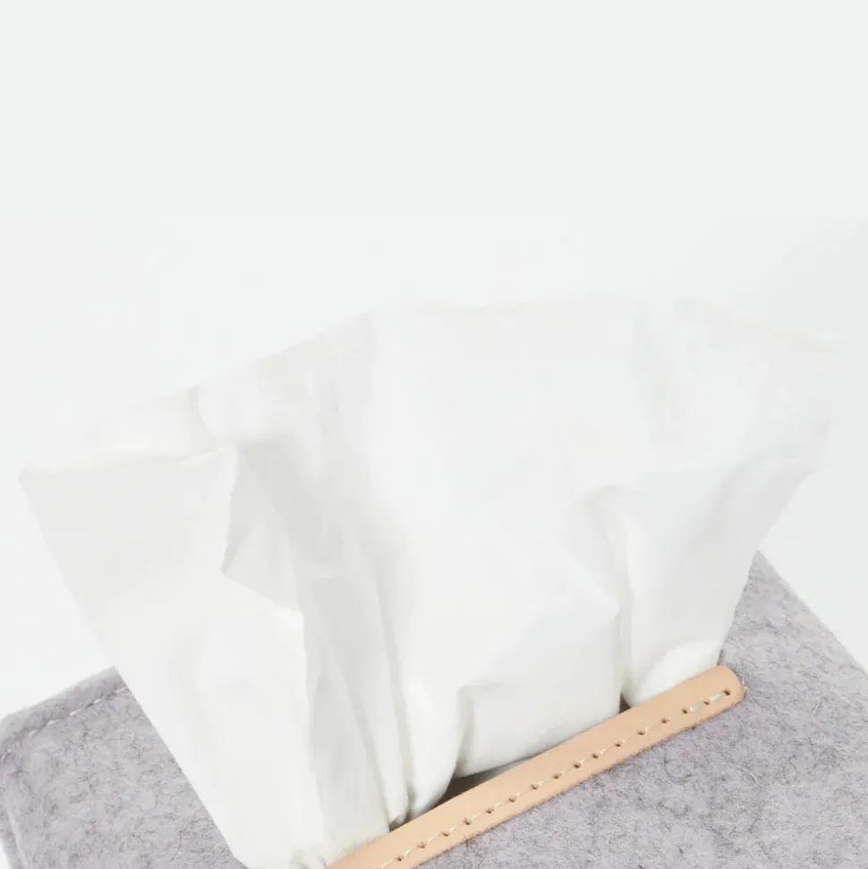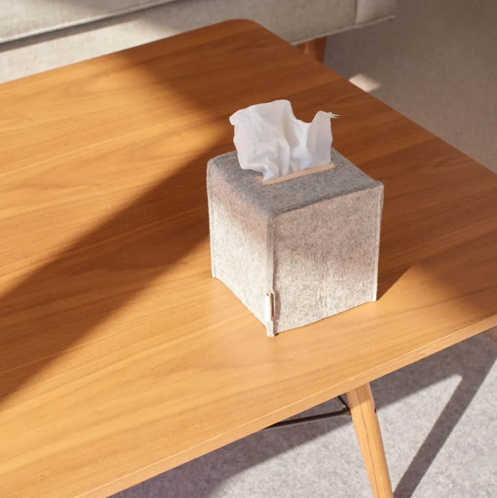 A stylish tissue box cover for the stylish home. Cover up branded tissue boxes with a simple and minimal felt sleeve for that last finishing touch in your home. Leather trimmed tissue opening.