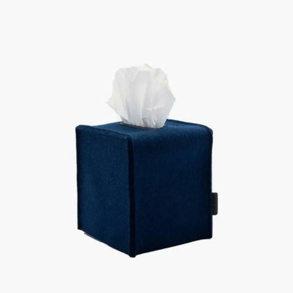 A stylish tissue box cover for the stylish home. Cover up branded tissue boxes with a simple and minimal felt sleeve for that last finishing touch in your home. Leather trimmed tissue opening.
