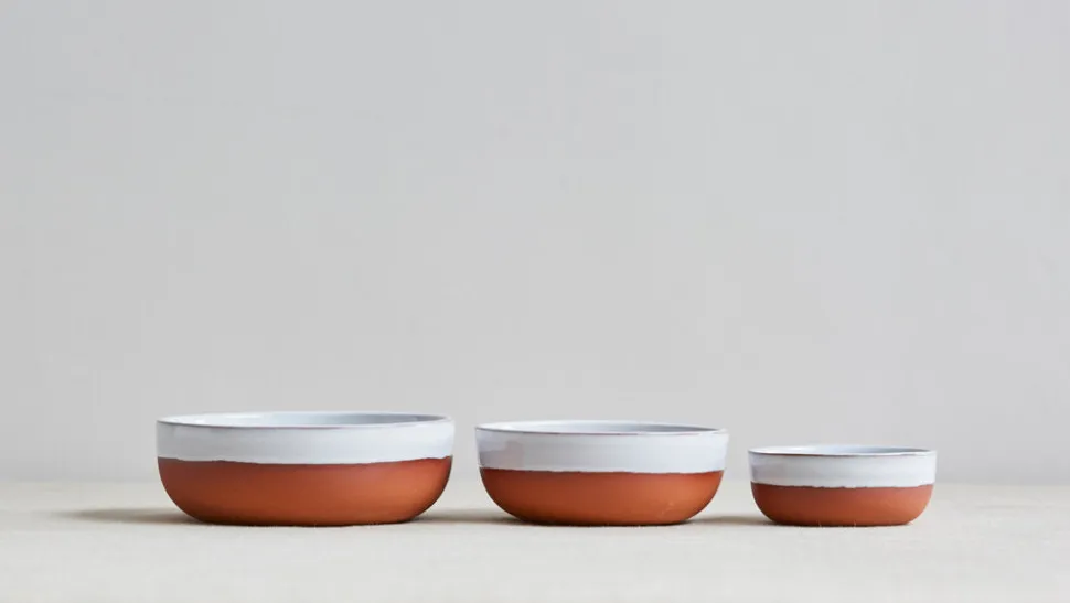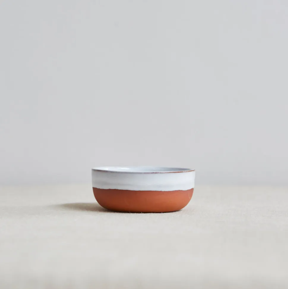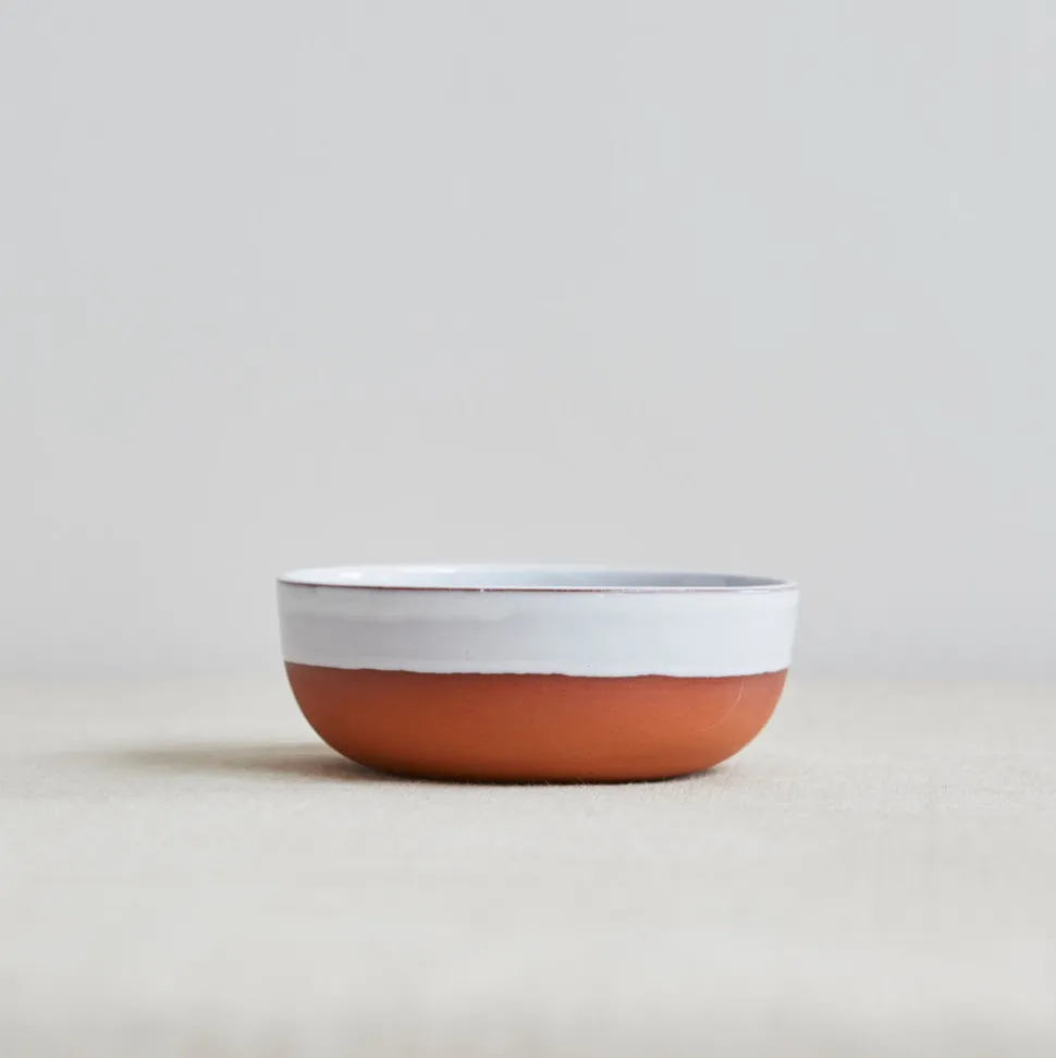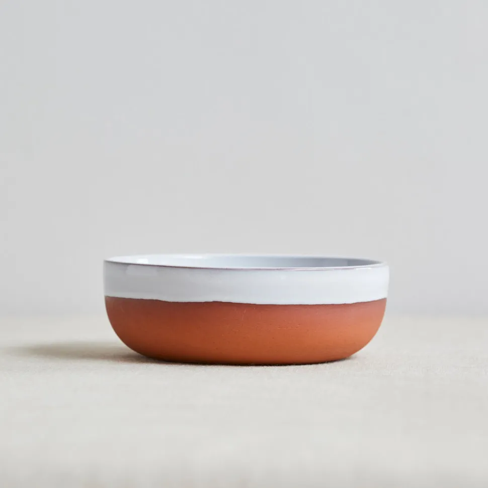 These bowls are slipcast in a small rural factory in Nottinghamshire using traditional hand processes. Glazed inside and partially glazed outside with a white tin glaze to contrast the earthy color of the red clay.