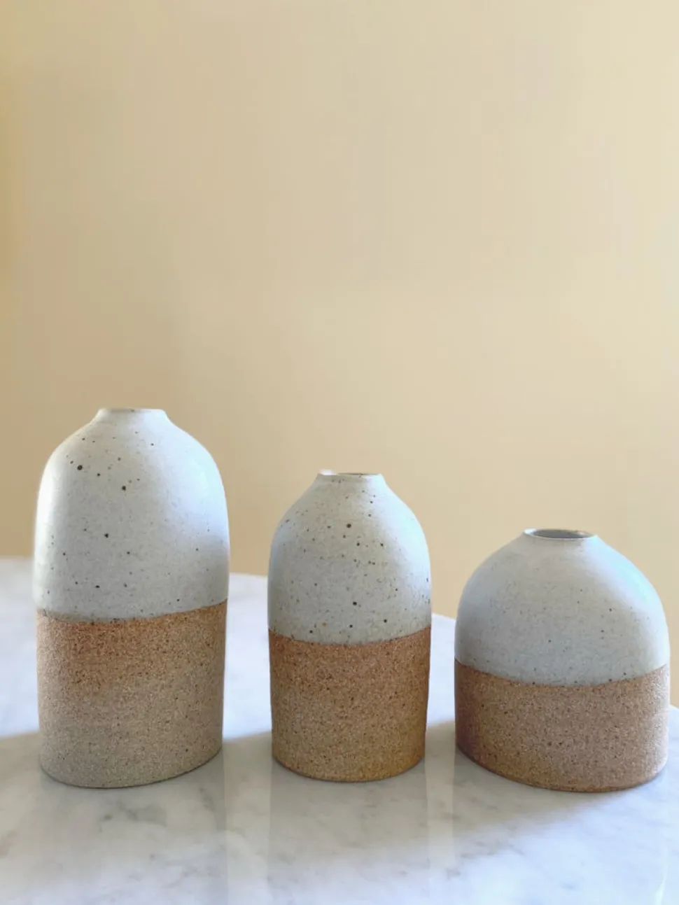 The glaze on these vases speckling reminiscent of a fragile bird egg.
