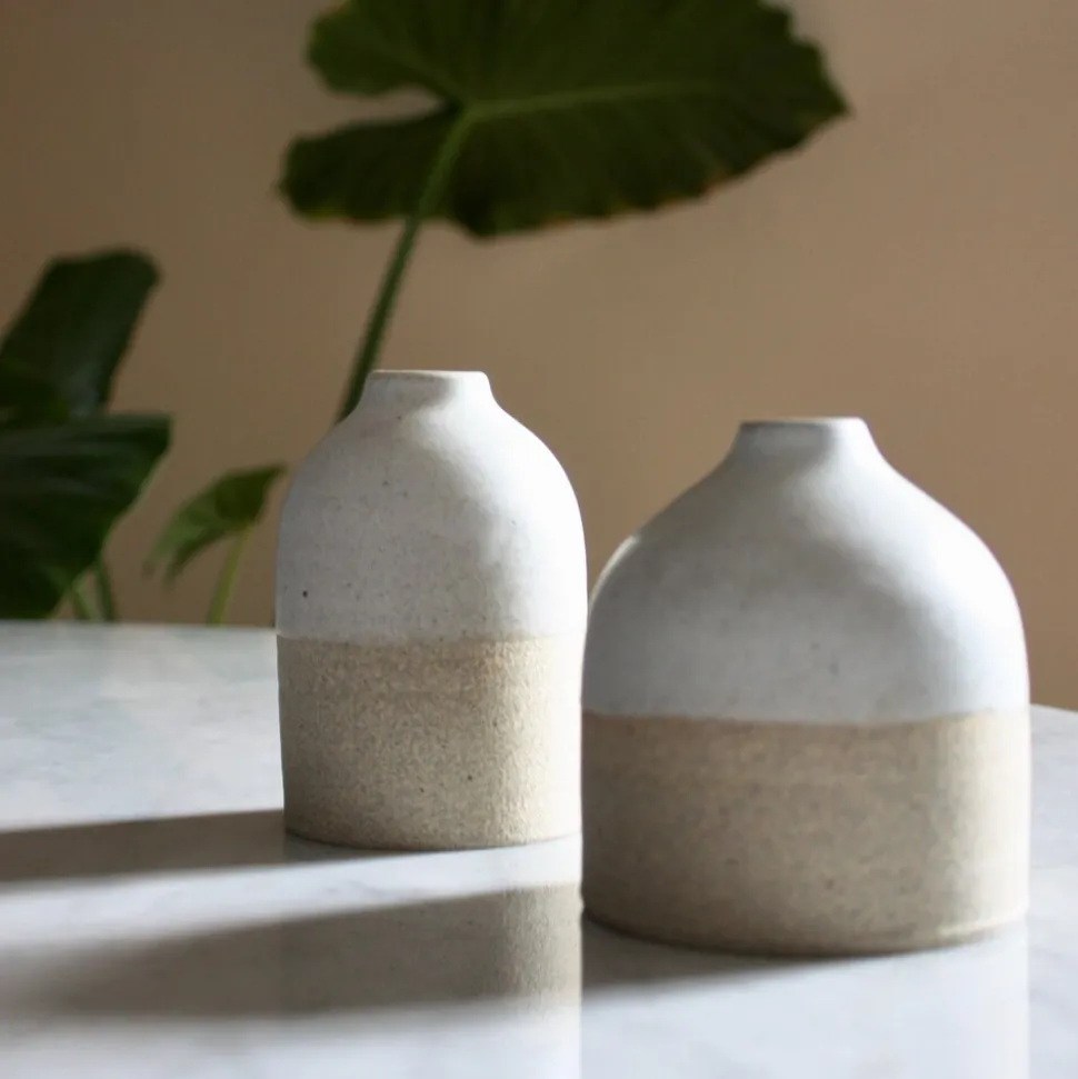 Simple and beautiful small vases from the small pottery studio of ceramicist Tomoko Morisaki. She draws inspiration from found objects in nature and aims to create simple, warm pieces to be used daily. All of her work is thrown on a wheel.